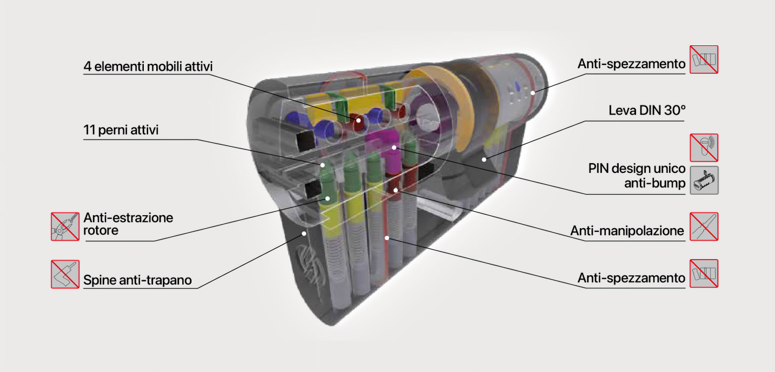Cilindro di altissima sicurezza con doppio sistema di cifratura meccanico a 11 perni e pista a 4 elementi mobili attivi.
